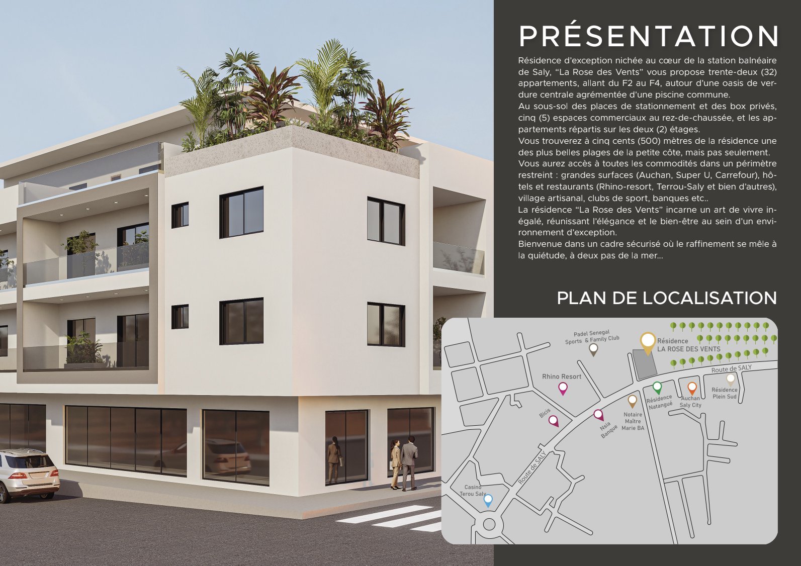 Résidence d’exception nichée au coeur de la station balnéaire de Saly, “La Rose des Vents” vous propose 32 appartements, allant du F2 au F4, autour d’une oasis de verdure centrale agrémentée d’une piscine commune. Au sous-sol des places de stationnement et des box privés, 5 espaces commerciaux au rez-de-chaussée, et les appartements répartis sur les deux 2 étages.